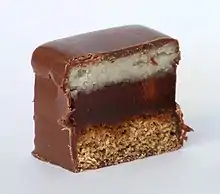 Dominostein (pièce de domino) enrobée de chocolat au lait, typique de la période de Noël allemande. Dans la vue en coupe, les trois couches sont clairement visibles : pain d'épice en bas, gelée de pomme au centre et persipan en haut.