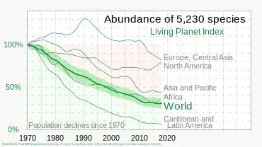Les espèces apparaissent, prospèrent et s'éteignent naturellement ; il est possible que seulement 2 à 4 % de toutes les espèces qui sont apparues survivent encore[4], mais le taux actuel d'extinctions est 100 à 200 fois plus élevé que ce qui serait attendu sans intervention humaine, selon la Convention sur la diversité biologique (CDB)[3]. Par exemple, 75 % de la variabilité génétique des plantes cultivables a déjà été perdue, environ 90 % de tous les grands poissons océaniques ont disparu au cours des 50 dernières années[20], il est estimé que l'abondance des insectes dans le monde a diminué de moitié en moyenne depuis les années 1970 et que les pertes s'accélèrent[21],[22], au cours de la même période, les populations mondiales de vertébrés ont diminué de 31 %, dont 60% sous les tropiques, et 40 % de toutes les espèces d'oiseaux sont en déclin. Parmi certains groupes de vertébrés, d'invertébrés et de plantes, 12 à 55 % sont menacés d'extinction. En 2009, l'Union internationale pour la conservation de la nature (UICN) a évalué 47 677 espèces, dont 36 % étaient considérées comme menacées d'extinction, certains groupes spécifiques étant représentés dans des proportions bien plus élevées. Sur les 12 055 espèces végétales évaluées, 70 % étaient menacées. Les groupes les plus gravement menacés sont les amphibiens et les coraux tropicaux, ces derniers étant en fort déclin[23]. Un grand nombre d'espèces, en raison du déclin de leur population, connaissent déjà une réduction marquée de leur variabilité génétique, ce qui les rend plus vulnérables aux maladies et aux parasites et nuit à leur capacité d'adaptation aux changements environnementaux et climatiques en cours[24]. Les causes du déclin récent restent inchangées ou s'aggravent ; dix des quinze principaux indicateurs utilisés par la CDB pour évaluer les tendances sont défavorables. Bien qu'il y ait plusieurs cas isolés de renversement de cette tendance, cela ne signifie pas une amélioration générale de la situation[25]. Les pertes devraient s'accélérer[26],[27].