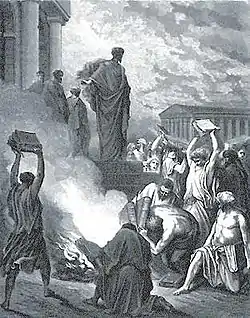 Selon Speyer, la destruction des livres de magie par les chrétiens remonte à un passage des Actes des Apôtres[47]. Il y est raconté comment Paul chassait les démons pour guérir les malades. Il y avait plus de succès que les « fils d'un grand-prêtre juif, Skeva », que l'on désignait comme « exorcistes juifs ambulants »[48]. Après le triomphe de Paul dans la ville d'Éphèse : « Plusieurs de ceux qui avaient cru venaient confesser et déclarer ce qu’ils avaient fait. Et un certain nombre de ceux qui avaient exercé les arts magiques, ayant apporté leurs livres, les brûlèrent devant tout le monde : on en estima la valeur à cinquante mille pièces d’argent[49]. » Dans ce passage, on ne peut que supposer d'après le contexte qu'il s'agit de livres de sortilèges[n 51]. Le grand nombre des livres ainsi anéantis rend improbable qu'il se soit agi uniquement de livres de magie dans le sens où nous l'entendons aujourd'hui.