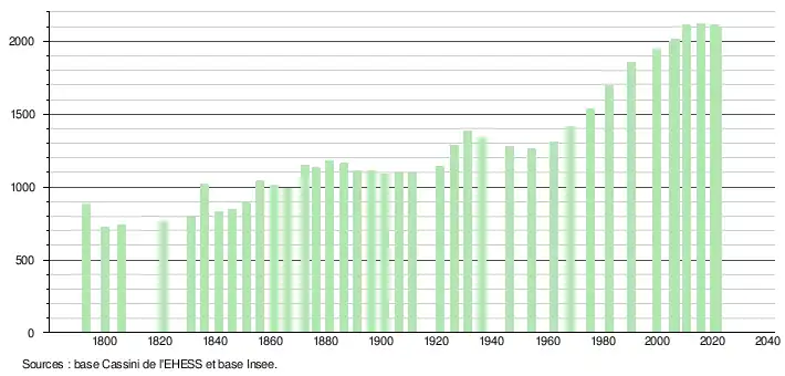 L'évolution du nombre d'habitants est connue à travers les recensements de la population effectués dans la commune depuis 1793. Pour les communes de moins de 10 000 habitants, une enquête de recensement portant sur toute la population est réalisée tous les cinq ans, les populations légales des années intermédiaires étant quant à elles estimées par interpolation ou extrapolation[27]. Pour la commune, le premier recensement exhaustif entrant dans le cadre du nouveau dispositif a été réalisé en 2005[28].