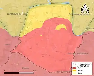 Le retrait-gonflement des sols argileux est susceptible d'engendrer des dommages importants aux bâtiments en cas d’alternance de périodes de sécheresse et de pluie. 99,7 % de la superficie communale est en aléa moyen ou fort (67,4 % au niveau départemental et 48,5 % au niveau national). Sur les 284 bâtiments dénombrés sur la commune en 2019, 284 sont en aléa moyen ou fort, soit 100 %, à comparer aux 84 % au niveau départemental et 54 % au niveau national. Une cartographie de l'exposition du territoire national au retrait gonflement des sols argileux est disponible sur le site du BRGM[30],[Carte 2].