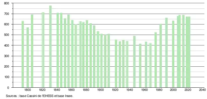 | L'évolution du nombre d'habitants est connue à travers les recensements de la population effectués dans la commune depuis 1793. Pour les communes de moins de 10 000 habitants, une enquête de recensement portant sur toute la population est réalisée tous les cinq ans, les populations légales des années intermédiaires étant quant à elles estimées par interpolation ou extrapolation[27]. Pour la commune, le premier recensement exhaustif entrant dans le cadre du nouveau dispositif a été réalisé en 2008[28]. En 2021, la commune comptait 673 habitants[Note 5], en augmentation de 0,6 % par rapport à 2015 (Gers : +0,79 %, France hors Mayotte : +1,84 %). |