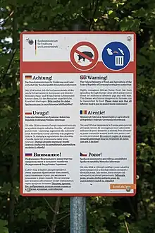 En , un cas est signalé à Nowogród Bobrzański, à 40 km de la frontière allemande. Les autorités allemandes se préparent par conséquent, en formant les chasseurs, les vétérinaires et les secouristes, et en s'équipant de drones ou de caméras infrarouges[34].