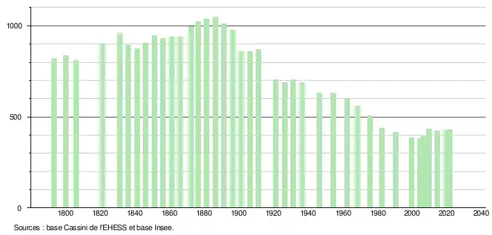 L'évolution du nombre d'habitants est connue à travers les recensements de la population effectués dans la commune depuis 1793. Pour les communes de moins de 10 000 habitants, une enquête de recensement portant sur toute la population est réalisée tous les cinq ans, les populations légales des années intermédiaires étant quant à elles estimées par interpolation ou extrapolation[32]. Pour la commune, le premier recensement exhaustif entrant dans le cadre du nouveau dispositif a été réalisé en 2004[33].