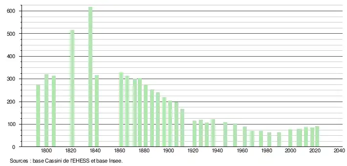 L'évolution du nombre d'habitants est connue à travers les recensements de la population effectués dans la commune depuis 1793. Pour les communes de moins de 10 000 habitants, une enquête de recensement portant sur toute la population est réalisée tous les cinq ans, les populations légales des années intermédiaires étant quant à elles estimées par interpolation ou extrapolation[17]. Pour la commune, le premier recensement exhaustif entrant dans le cadre du nouveau dispositif a été réalisé en 2007[18].