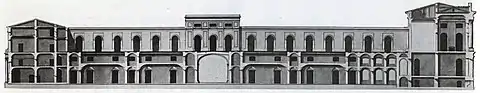 En 1762, les instructions sont données de détruire les maisons délabrées de Nikolaï Golovine et de Cornelius Kruys (en) et de construire à leur emplacement des écuries pour les chevaux des reîtres, des hangars pour voitures et une cour. Cependant d'après le projet de Bartolomeo Rastrelli, le palais d'Hiver devait garder une vue du côté oriental et du côté du Petit Ermitage. L'architecte a malgré ces contraintes présenté son plan des nouvelles constructions[1], mais sa réalisation a été retardée. L'édification du bâtiment du futur Petit Ermitage ainsi que des écuries et du manège n'a commencé qu'en 1764, sous la direction de Georg Friedrich Veldten. Le centre du complexe devait être une orangerie, sous forme de pavillon donnant sur le quai du Palais, avec un jardin suspendu. La première partie de ce jardin suspendu du Petit Ermitage a été réalisée pour donner sur la rue Millionnaïa (c'est le pavillon sud). En 1769, le pavillon nord a été achevé par Jean-Baptiste Vallin de La Mothe, qui y a prévu, à l'intérieur, des plateaux de levage. La construction et la finition n'ont été terminés qu'en 1775, avec la réalisation des galeries latérales.