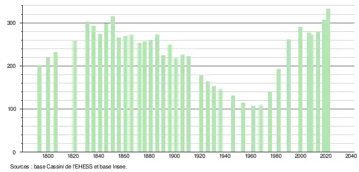 L'évolution du nombre d'habitants est connue à travers les recensements de la population effectués dans la commune depuis 1793. Pour les communes de moins de 10 000 habitants, une enquête de recensement portant sur toute la population est réalisée tous les cinq ans, les populations légales des années intermédiaires étant quant à elles estimées par interpolation ou extrapolation[22]. Pour la commune, le premier recensement exhaustif entrant dans le cadre du nouveau dispositif a été réalisé en 2008[23].