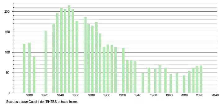 L'évolution du nombre d'habitants est connue à travers les recensements de la population effectués dans la commune depuis 1793. Pour les communes de moins de 10 000 habitants, une enquête de recensement portant sur toute la population est réalisée tous les cinq ans, les populations légales des années intermédiaires étant quant à elles estimées par interpolation ou extrapolation[16]. Pour la commune, le premier recensement exhaustif entrant dans le cadre du nouveau dispositif a été réalisé en 2006[17].