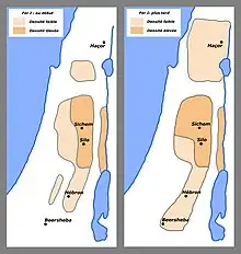 Antérieurement, selon Israël Finkelstein[12], cette vague d'implantations a été précédée par deux autres : une première vague d'implantations au Bronze ancien (-3500, -2200), suivie d'un abandon de la plupart des sites au Bronze intermédiaire (-2200, -2000), puis une seconde vague d'implantations au Bronze moyen (-2000, -1550), suivie à nouveau d'un abandon de la plupart des sites au Bronze récent (-1550, -1150). La troisième vague d'implantation s'effectue sur un territoire pratiquement vidé (restent seulement vingt-cinq sites, voir la seconde carte et comparer à la première).