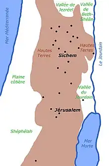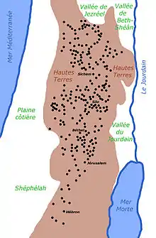 Cette carte montre l’emplacement des sites archéologiques d’implantation au Bronze Récent, sur les Hautes Terres de Canaan. Carte dessinée d’après le film « La Bible dévoilée », (Israël Finkelstein). La vague d'implantation des Israélites au Fer I va se faire sur un territoire pratiquement déserté.