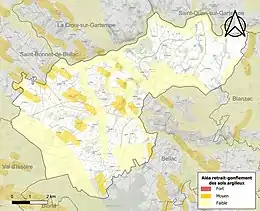 Le retrait-gonflement des sols argileux est susceptible d'engendrer des dommages importants aux bâtiments en cas d’alternance de périodes de sécheresse et de pluie[22]. 8,2 % de la superficie communale est en aléa moyen ou fort (27 % au niveau départemental et 48,5 % au niveau national métropolitain)[Carte 2]. Depuis le , en application de la loi ÉLAN, différentes contraintes s'imposent aux vendeurs, maîtres d'ouvrages ou constructeurs de biens situés dans une zone classée en aléa moyen ou fort[Note 3],[23].
