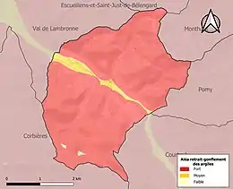 Le retrait-gonflement des sols argileux est susceptible d'engendrer des dommages importants aux bâtiments en cas d’alternance de périodes de sécheresse et de pluie. 99,8 % de la superficie communale est en aléa moyen ou fort (75,2 % au niveau départemental et 48,5 % au niveau national). Sur les 44 bâtiments dénombrés sur la commune en 2019, 44 sont en aléa moyen ou fort, soit 100 %, à comparer aux 94 % au niveau départemental et 54 % au niveau national. Une cartographie de l'exposition du territoire national au retrait gonflement des sols argileux est disponible sur le site du BRGM[18],[Carte 3].
