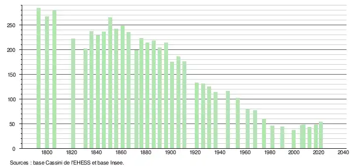 L'évolution du nombre d'habitants est connue à travers les recensements de la population effectués dans la commune depuis 1793. Pour les communes de moins de 10 000 habitants, une enquête de recensement portant sur toute la population est réalisée tous les cinq ans, les populations légales des années intermédiaires étant quant à elles estimées par interpolation ou extrapolation[19]. Pour la commune, le premier recensement exhaustif entrant dans le cadre du nouveau dispositif a été réalisé en 2007[20].
