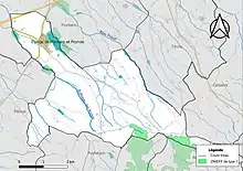 L'occupation des sols de la commune, telle qu'elle ressort de la base de données européenne d’occupation biophysique des sols Corine Land Cover (CLC), est marquée par l'importance des territoires agricoles (75,2 % en 2018), une proportion sensiblement équivalente à celle de 1990 (75,8 %). La répartition détaillée en 2018 est la suivante : terres arables (38,8 %), forêts (22,5 %), prairies (21,8 %), zones agricoles hétérogènes (11,3 %), cultures permanentes (3,3 %), zones urbanisées (1,3 %), eaux continentales[Note 5] (0,9 %)[21]. L'évolution de l’occupation des sols de la commune et de ses infrastructures peut être observée sur les différentes représentations cartographiques du territoire : la carte de Cassini (XVIIIe siècle), la carte d'état-major (1820-1866) et les cartes ou photos aériennes de l'IGN pour la période actuelle (1950 à aujourd'hui)[Carte 2].