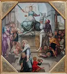 Le tableau conservé est l’allégorie de la Justice et il était accompagné au moins de l’allégorie de l’Injustice et de celle de l’Autorité[28]. Ces trois tableaux sont tous organisés de la même manière, avec l’allégorie principale au centre, entourée d’allégorie secondaires et de symboles, par exemple sur l’Allégorie de la Justice se trouve à droite le juge Samuel tenant la statuette de la Vérité et piétinant l’Envie et l’Avarice[29]. Un quatrième tableau, l’allégorie de la Politique, n’est pas décrit comme faisant partie du cadeau bernois, mais est organisé exactement de la même manière et faisait probablement partie des toiles exposées dans la salle d’audience[26].