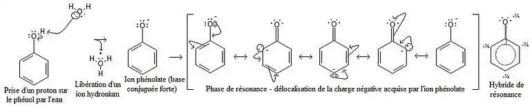 Les phénols sont plus acides que les alcools. Un ion phénolate, base conjuguée d'un phénol, est stabilisé par résonance et est plus stable qu'un ion alcoolate. En effet, lors de la prise du proton du groupe hydroxyle, le doublet électronique est partagé sur trois atomes de carbone ; ainsi la charge est délocalisée, et l'ion est beaucoup plus stable que sur un alcool, où la charge négative serait trop importante et s'approprierait le proton laissé immédiatement après.