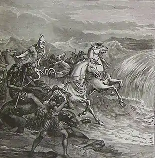 Une série de passages bibliques suggère que le Pharaon de l'Exode meurt noyé dans les eaux dans sa poursuite des Hébreux. Ces derniers traversent la mer à pied ; les Égyptiens les poursuivent mais les eaux reviennent, et recouvrent leurs chars. « Les cavaliers et toute l’armée de Pharaon, qui étaient entrés dans la mer après les enfants d’Israël ; et il n’en échappa pas un seul » (Exode 14, v.28). Une séquence, assez claire, se présente au lecteur :