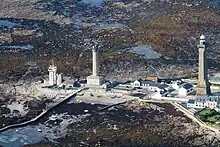 Le phare se situe dans une cour rectangulaire d'environ 80 mètres par 60[10]. Elle est ceinte d'un mur, dont la face nord qui n'est pas directement exposée à la mer n'a été construite qu'en 1924 à la suite d'un raz de marée[27]. Elle contient en outre les logements des gardiens contre son extrémité ouest et la machinerie près de la face ouest de la tour[28]. Le sol de la cour est décoré, symétriquement aux pieds des faces nord et sud du phare, de deux grands dessins en pierre d'ancre et d'étoile à cinq branches. Le phare est structuré, de bas en haut, comme suit[29] :