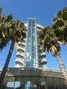 Cette construction compte dix étages, deux ascenseurs extérieurs de dix-huit places ainsi que des escaliers de secours. D'une hauteur de 45 mètres, la tour comporte une antenne longue de 34 mètres, faisant culminer la hauteur de la tour à 71 mètres. Le coût des travaux s'est élevé à 3,9 M€ HT[3],[4]
