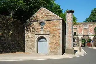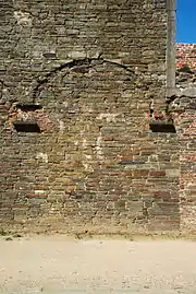 L'espace compris entre les deux arcades est bordé au nord d'un mur en moellons de schiste présentant des traces d'arcs de décharge et d'impostes ainsi qu'une haute fenêtre dont il ne reste que l'encadrement en pierre bleue terminé par un arc en anse de panier.