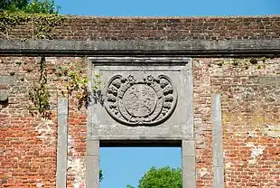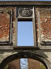 Les deux fenêtres latérales étaient surmontées d'un linteau bombé à clé saillante tandis que celle du centre supportait une dalle armoriée[2] portant le blason et la devise « Fideliter et Suaviter » (Fidélité et clémence) de Léonard Pirmez[14],[15], 66e et antépénultième abbé de l'abbaye en 1783-1784[16], accompagnés du millésime « Anno 1784 ».