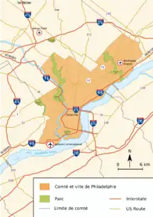 - Les autres autoroutes comme l'Interstate 476 et l'Interstate 276 parcourent l'agglomération de Philadelphie sans entrer dans le territoire de la municipalité (voir la carte)