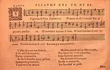 - Les deux éditions portent une longue dédicace à Charles IX, qui loue le roi pour sa politique de tolérance et de pacification, ainsi qu’un privilège royal octroyé à l’auteur du [23]. Il s’agit ici d’une harmonisation à 4 voix (sauf pour 4 psaumes à 5 voix), en style homophonique ou en contrepoint fleuri, sur les mélodies officielles du Psautier de Genève achevé depuis 1562. La plupart des pièces de la 'Psalmodie' de 1559 s'y retrouvent, parfois modifiées. Ce recueil est comparable à ceux que donnèrent Claude Goudimel, Richard Crassot ou Claude Le Jeune à pareille époque.