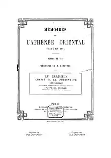 - Le religieux chassé de la communauté, conte bouddhique, Paris, Mémoires de l’Athénée oriental. Session 1872, 22 p. (lire sur Commons: voir ci-contre)