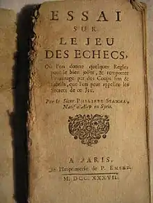(fro) Philippe Stamma, Essai sur le jeu des echecs : où l'on donne quelques Regles pour le bien joüer, & remporter l'avantage par des Coups fins & ſubtils, que l'on peut appeller les Secrets de ce Jeu, Paris, impr. Emery, (lire en ligne)