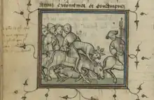 La mort accidentelle de Philippe de France représentée dans une enluminure ornant un manuscrit des Grandes Chroniques de France, vers 1332-1350, British Library. | |