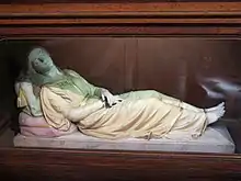 Le tombeau ouvert, on découvrit des restes humains ainsi qu'une ampoule de verre contenant du sang desséché. Les médecins présents constatèrent que le crâne avait été fracturé et que les restes étaient ceux d'une jeune fille âgée entre 12 et 15 ans. En raison des emblèmes et de la fiole de sang on crut qu’il pouvait s’agir de la tombe d'un martyr.