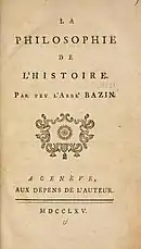 L'expression « philosophie de l'histoire » apparaît chez Voltaire en 1765, comme le titre d'un essai qu'il publie sous le pseudonyme de l'abbé Bazin. Si la formule fera date, l'ouvrage est un ensemble hétéroclite de questions concernant aussi bien l'Inde, la Chine et les Juifs que les anges, les génies ou les préjugés populaires[59]. Son impact est loin d'égaler celui de l'Essai sur les mœurs et l'esprit des nations, paru en 1756, qui constitue l'une des pièces maîtresses de la philosophie des Lumières et dans lequel l'auteur dresse un vaste panorama de l'histoire de l'Europe, débutant avant Charlemagne et se déroulant jusqu'à l'aube du siècle de Louis XIV[60].