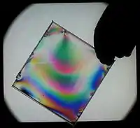 - Applications en architecture : la construction d’édifices architecturaux ou de génie civil nécessite la connaissance fine des contraintes au sein de la structure, afin d’en prévenir de possibles ruptures. Par exemple, en réalisant une maquette miniature de l’édifice en matériau photoélastique, il est possible d’accéder à des données pour étudier et comparer a posteriori les méthodes de construction des cathédrales de Chartres et Bourges[4].