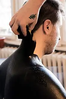 Peindre le corps humain en noir est également utilisé dans la photographie low-key en utilisant des colorants ou des pigments non toxiques afin d'assombrir et d'améliorer autant que possible la couleur des sujets photographiés et d'obtenir les effets souhaités[63]. Pour obtenir l'effet de réflexion de la lumière qui crée un contour blanc du corps peint, ainsi qu'un contraste élevé entre le noir et le blanc, divers colorants sont alors mélangés à des crèmes pour le corps et utilisés. Il s'agit généralement de henné, de détrempe ou de peinture acrylique. Le latex liquide, composé de latex naturel et de colorants, est également utilisé avec prudence pour laisser la peau respirer[71],[72].