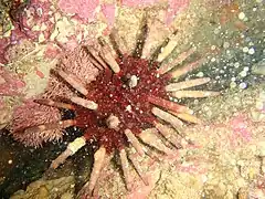 C'est un petit oursin régulier au test (coquille) sphérique généralement rouge, autour duquel rayonnent des piquants (« radioles ») clairsemés, cylindriques et très épais (il fait partie de la catégorie des « oursins-crayons » ou « oursins baguettes »). Ceux-ci sont généralement recouverts d'algues (épibiontes) qui les font paraître gris, alors que les plus jeunes (au sommet) sont souvent rougeâtres ; leur longueur dépasse rarement le diamètre du test (7 cm max pour le test). Les radioles secondaires, plus courtes, sont généralement de la même couleur que le test, et font office d'écailles recouvrant le test et les mamelons des radioles primaires. Les ambulacres sont distinctement sinueux.