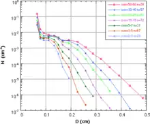 Selon la masse d'air et la distribution utilisée, le diamètre moyen des gouttes de nuage tel que noté par télédétection varie autour de 14 μm dans les nuages continentaux et de 15 à 20 % de plus dans ceux maritimes[14]. Il est également possible de calculer une distribution du diamètre des cristaux de glace et le diamètre moyen sera 25 μm sur terre et d'environ 5 % de plus en mer[14].