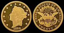 La pièce de 20 dollars Liberty Head (également appelée Coronet)[18] est conçue par James B. Longacre. Pour créer l'avers de la pièce, il utilise l'image du profil de la personnification de la liberté créée par William Kneass pour la pièce d'une valeur de 2,5 dollars, puis modifiée par Christian Gobrecht en 1840 pour un projet de pièce du même montant[19]. Autour du profil, Longrace place 13 étoiles à six branches, et sous la tête, il insère la date. Au revers de la pièce frappée de 1850 à 1866, on trouve un aigle aux ailes déployées, un bouclier de l'Union sur la poitrine, une branche d'olivier et des flèches dans les serres. Au-dessus de la tête de l'aigle se trouve une auréole avec des étoiles et des rayons. Au-dessus de l'aigle figure le nom du pays « UNITED STATES OF AMERICA, et sous l'aigle, le montant de la pièce avec l'abréviation du nom de la monnaie « TWENTY D. »[20].