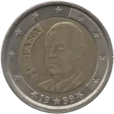 Le buste de Juan Carlos Ier (1938- ), roi d'Espagne, tourné légèrement vers la gauche. À gauche, la mention du pays émetteur ESPAÑA en creux. Le tout est entouré des 12 étoiles du drapeau européen, dont 4 sont en creux et 8 en relief, entre lesquelles est apposé le millésime en 2 parties, sur l'anneau extérieur.