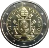 L'effigie du pape Benoît XVI (1927-2022), portant une calotte, légèrement tournée vers la droite et entourée de la mention du pays émetteur CITTÀ DEL VATICANO. À droite, le millésime. Le tout est entouré des 12 étoiles du drapeau européen, sur l'anneau extérieur.