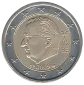 L'effigie d'Albert II (1934- ), Roi des Belges, tournée vers la gauche et entourée des 12 étoiles du drapeau européen sur l'anneau. Les étoiles sont interrompues, à droite, par le monogramme royal d'Albert II et par le millésime.