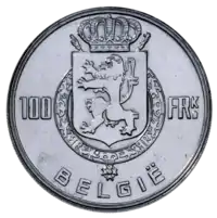 | Remarques – La pièce marque le 40e anniversaire du mariage d'Albert et Paola, princes de Liège et futur couple royal, le 2 juillet 1959. Le projet original comportait le Palais royal de Bruxelles à la place de l'Hôtel de ville. La version proof a été émise en frappe médaille. La pièce est démonétisée par la loi du 10 décembre 2001, à la suite de l'adoption de l'euro par la Belgique. | |||||