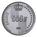 | Avers : Buste de l'empereur Charles Quint de face, à la droite du Prinsenhof de Gand. Les années 1500 et 1558 sont placées respectivement au-dessus et en dessous du buste. À gauche est repris le nom de l'empereur en latin : CAROLUS V. | Revers : Globe terrestre reprenant une carte des 15 pays membres de l'Union européenne, à côté du mot EURO complété en plus petit par les syllabe PE et PA, en vertical et la valeur nominale 500 F également en vertical et le millésime 2000. Un cercle composé des 12 étoiles symbolisant l'Union européenne et la légende trilingue BELGIQUE - BELGIE - BELGIEN entoure le globe. | ||||