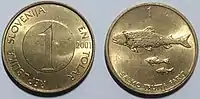 1 tolar | 22,0 mm | 4,50 g | 78 % Cu 20 % Zn 2 % Ni | une truite avec la mention SALMO TRUTTA FARIO et la valeur faciale 1 | La valeur faciale 1 dans un cercle avec les mentions REPUBLIKA SLOVENIJA et EN TOLAR | ||