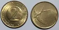 2 tolars | 24,0 mm | 5,40 g | une hirondelle avec la mention HIRUNDO RUSTICA et la valeur faciale 2 | La valeur faciale 2 dans un cercle avec les mentions REPUBLIKA SLOVENIJA et DVA TOLARJA | |||