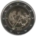 Tous les pays de la zone euro, dont la Finlande, ont émis le 25 mars 2007 une pièce commémorative de 2 € pour célébrer le 50e anniversaire du traité de Rome. Le centre de la pièce représente le traité signé par les six États membres fondateurs devant un arrière-plan évoquant le dallage, dessiné par Michel-Ange, de la place du Capitole, à Rome, où le traité a été signé le 25 mars 1957. Le mot EUROOPPA (Europe) figure au-dessus du livre. La légende ROOMAN SOPIMUS (Traité de Rome) et 50 V (50 ans) est inscrite au-dessus du dessin. Le millésime 2007 et le nom du pays émetteur en finnois et en suédois SUOMI FINLAND sont inscrits sous le dessin. L'anneau externe de la pièce comporte les douze étoiles du drapeau européen. | ||||||