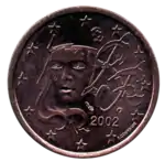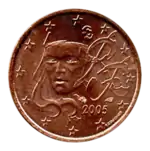 - Pièces de 1, 2 et 5 centimes : L'effigie de Marianne, allégorie de la République française, portant le bonnet phrygien, tournée légèrement vers la gauche. À gauche, la mention du pays émetteur représenté par les initiales RF pour République française, au-dessus du millésime. Le tout est entouré des 12 étoiles du drapeau européen. La gravure est une création de Fabienne Courtiade.