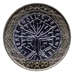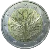 - Pièces de 1 et de 2 euros : Un arbre dans un hexagone, représentant la France, garni de la devise de la France LIBERTÉ ÉGALITÉ FRATERNITÉ[13]. Le millésime est en bas à gauche. Le tout est entouré des 12 étoiles du drapeau européen. La gravure est une création de Joaquin Jimenez.
