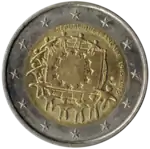 Tous les pays de la zone euro, dont la France, ont émis le 25 mars 2007 une pièce commémorative de 2 € pour célébrer le 50e anniversaire du traité de Rome. Le centre de la pièce représente le traité signé par les six États membres fondateurs devant un arrière-plan évoquant le dallage, dessiné par Michel-Ange, de la place du Capitole, à Rome, où le traité a été signé le 25 mars 1957. Le mot EUROPE figure au-dessus du livre. La légende TRAITÉ DE ROME et 50 ANS est inscrite au-dessus du dessin. Le millésime 2007 et le nom du pays émetteur RÉPUBLIQUE FRANÇAISE sont inscrits sous le dessin. L'anneau externe de la pièce comporte les douze étoiles du drapeau européen. | ||||||
