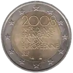 La légende 2008 PRÉSIDENCE FRANÇAISE UNION EUROPÉENNE et l'acronyme du pays émetteur RF (pour République française). L'anneau externe de la pièce comporte les douze étoiles du drapeau européen.