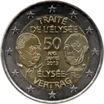 | 2013 | France et Allemagne | 50e anniversaire du Traité de l'Élysée | Charles de Gaulle et Konrad Adenauer entourant "50 ANS JAHRE 2013" | 30 millions de pièces allemandes et 10 millions de pièces françaises |